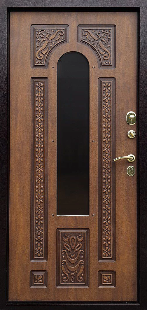 При изготовлении двери с отделкой виноритом на заказ, её можно сделать как глухой, так и декорированную вставками из стекла с элементами ковки. Для установки в дом такую дверь можно сделать с применением терморазрыва, и эта дверь будет надежно сохранять в доме тепло, не промерзая и не конденсируя.